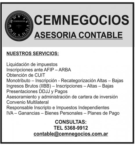 Cemnegocios brinda servicios de asesoramiento contable: Liquidación de impuestos, Inscrip. ante AFIP/ARBA; Obtención de CUIT; Monotributo/Inscrip/Recategorización Altas/Bajas; Ingresos Brutos (IIBB)/Inscrip./Altas/ Bajas; Presentaciones DDJJ y Pagos; Convenio Multilateral; Responsable Inscripto e Impuestos Independientes; IVA/Ganancias/Bienes; Personales/Planes de Pago