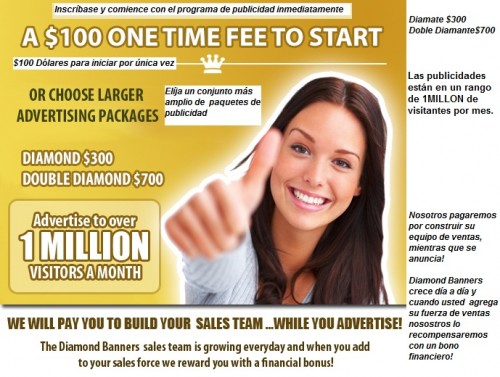 Es la última plataforma de publicidad que resuelve dos problemas en la industria de los negocios de publicidad y los basados en el trabajo desde casa. En primer lugar, Diamond Banners ofrece anuncios de texto, anuncios de banner, y el de registro en anuncios para promocionar los negocios de las personas de están involucrados pulg En segundo lugar, Banners Diamond ofrece un flujo de efectivo rápido con la mejor de las matrices 2×2 forzada.