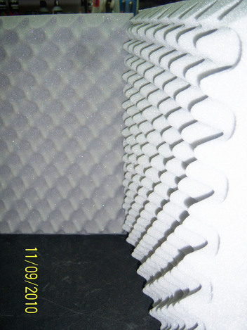 Placas acústicas fonoabsorbentes para utilizar como revestimiento acústico en interiores, con formato superior de cunas anecoicas o cunas piramidales . Las placas son aptas para reducir el eco o reverberación producida en el ambiente, producto de música o voces.