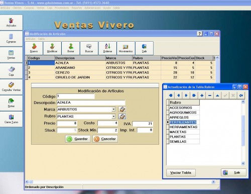 El programa Vivero, permite realizar de manera ágil y sin complicaciones la gestión comercial de su negocio: artículos, precios, stock, clientes, proveedores, compras, ventas, caja, facturación, etc.